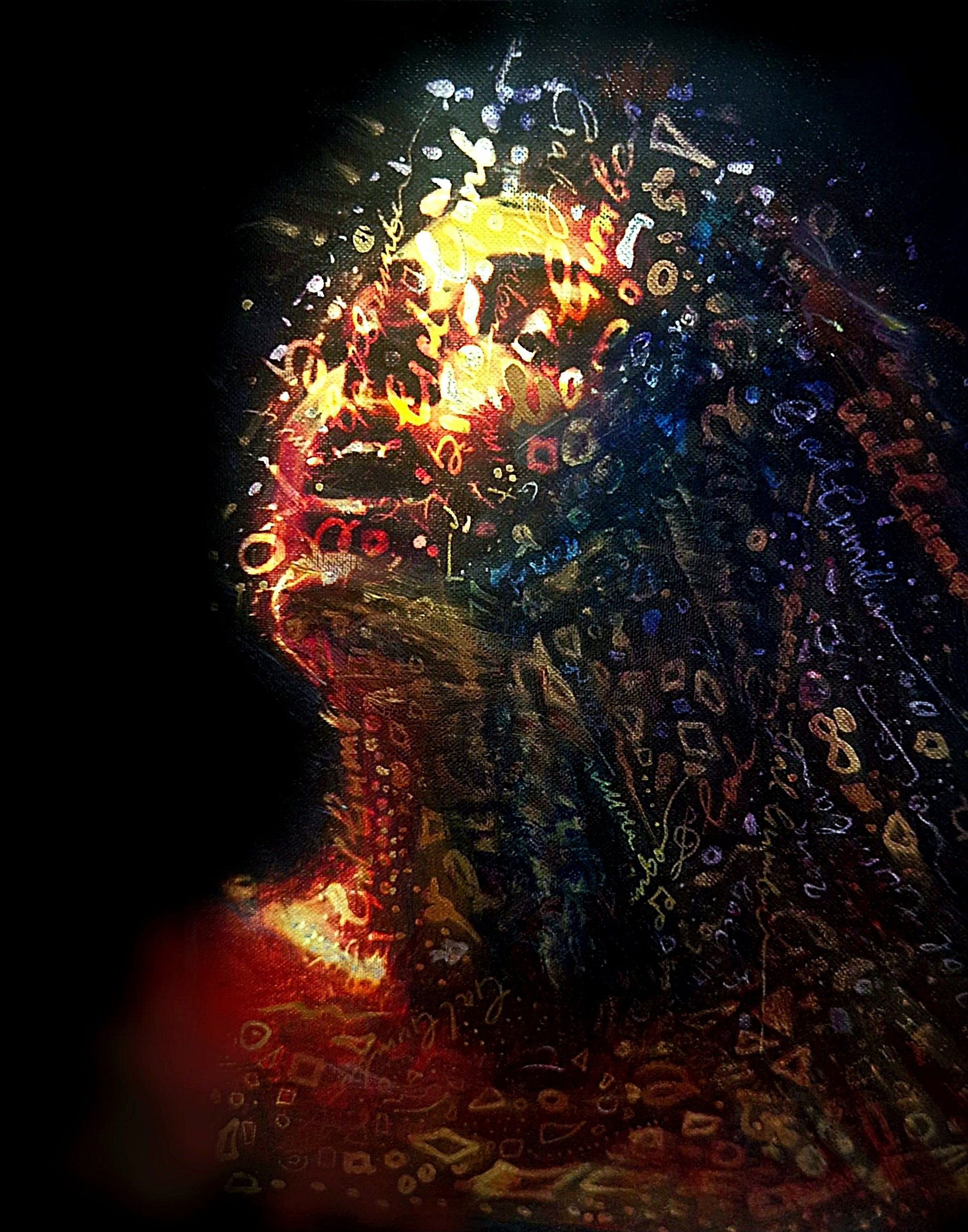 The face emerged from the chaos of words, symbols, shapes and scribbles of the background. It made me think of going very high on the swings, carefree, enjoying a moment alone with the nature, under a big tree, protected from the summer heat, yet catching some delicious rays of sun on your face and wind in your hair as you free-fall - total bliss! A happy place if you ever need to borrow one.
