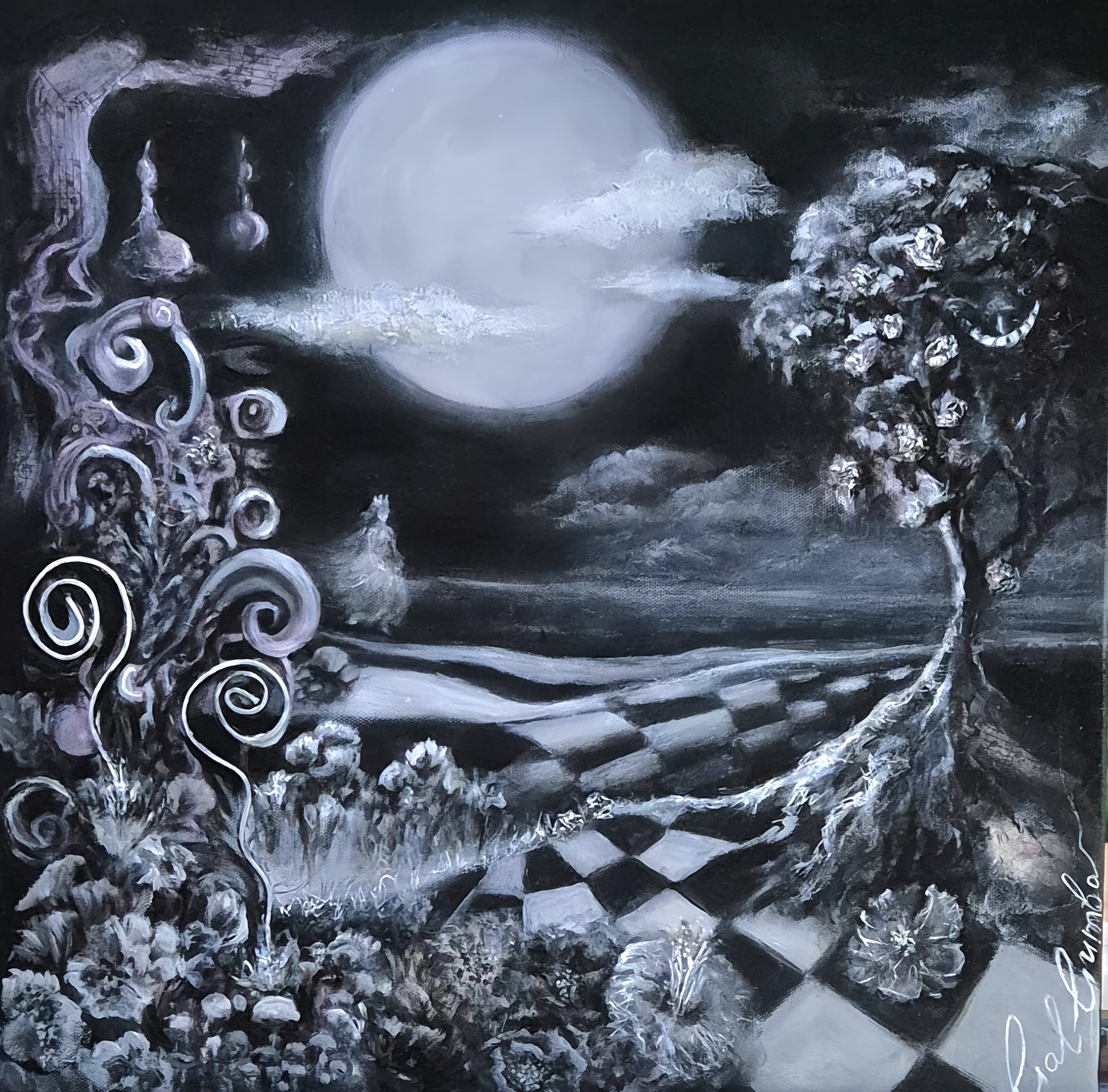 To me the checkerboard always associated with Alice —not only because it was a theme of “Through the looking glass”, but also because it’s a symbol of life’s duality and choices. The path never simply lies flat, but bends and transforms, a tension between the structured and the organic, the rational and the fantastical.